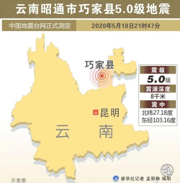 2020年5月18日21时47分59秒在云南昭通市巧家县小河镇发生5.0级地震,震中位置北纬27.18度、东经103.16度,震源深度约8公里。