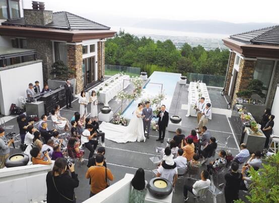 这场高端订制婚礼的举办地大理海纳尔·云墅度假酒店,是云南唯一的全球小型奢华酒店,婚礼的订制费用为28万元,包括了国内一线摄影摄像团队来回包机航拍、婚礼策划、包店住宿、晚宴等等相关费用。酒店总经理李锦娥说,酒店2018年开业以来,已接待了4场类似的包店订制婚礼,订制婚礼的新人以北上广居多。