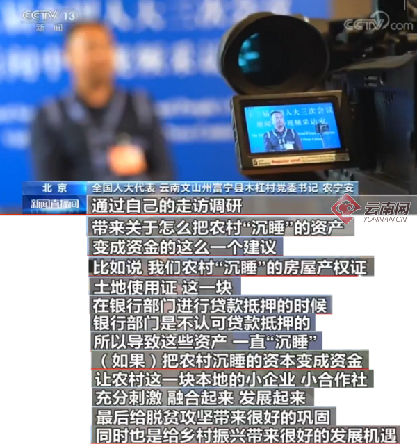 全国人大代表 云南文山州富宁县木杠村党委书记 农宁安:通过自己的走访调研带来这个关于怎么把农村“沉睡”的资产变成资金的这么一个建议。比如说,我们农村“沉睡”的房屋产权证、土地使用证,在银行部门进行贷款抵押的时候,银行部门是不认可贷款抵押的,所以导致这些资产一直“沉睡”。(如果)把农村“沉睡”的资本变成资金,让农村的小企业、小合作社充分刺激发展起来,最后也是给脱贫攻坚带来很好的巩固,同时也是给乡村振兴带来很好的发展机遇。