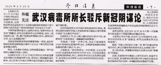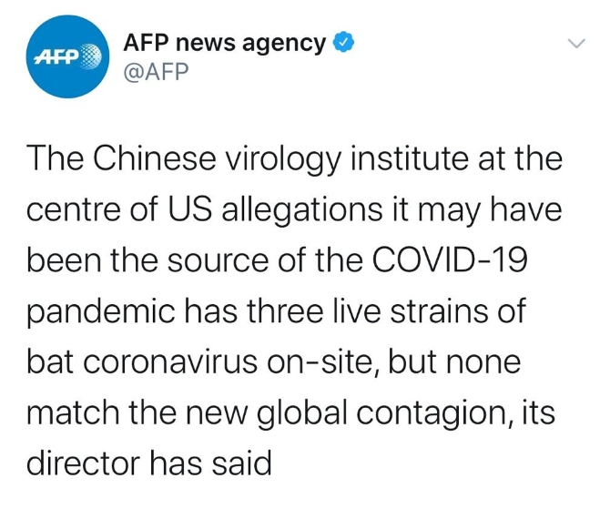 另据法新社5月24日报道,武汉病毒研究所所长说,该所有三株蝙蝠的冠状病毒,但它们都与目前在世界各地引发混乱的新冠病毒不相匹配。