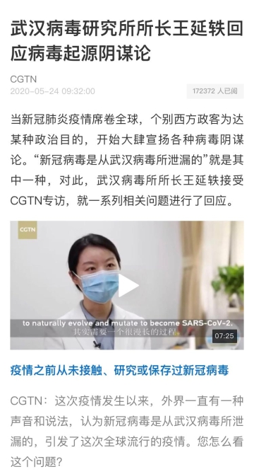 当新冠肺炎疫情席卷全球,个别西方政客为达某种政治目的,开始大肆宣扬各种病毒阴谋论。对此,武汉病毒研究所所长王延轶在接受中国环球电视网(CGTN)专访时驳斥了新冠阴谋论,引发外媒关注。