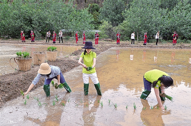 5月26日,九乡旅游区在马蹄湾举办以“百年圆梦·多样和谐”为主题的2020年九宝稻梦乐园开秧门仪式。到8月,游客在马蹄湾和河湾将欣赏到由彩色水稻绘就的大熊猫、滇金丝猴、亚洲象、动车等漂亮图案。