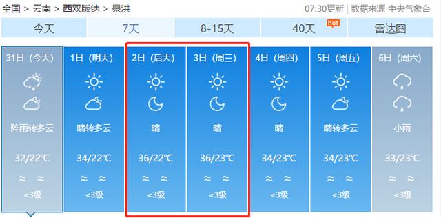 景洪气温也紧随其后将达到36℃