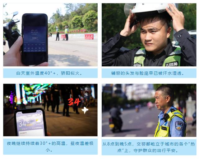 焦阳似火的环境下,公安民警戴着厚重的装备在城市街道、边境一线巡逻执勤,脸颊、脖子、手臂被晒得黝黑甚至爆皮,汗水浸湿了帽檐,湿透了警服,警察陆尊鼎说:一天10瓶水都感觉渴.....