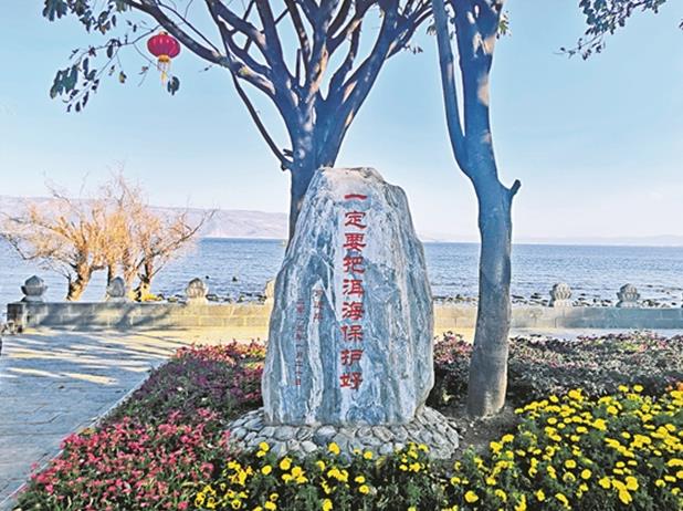 仲夏时节,洱海的碧水清波与青瓦白墙的白族民居,在蓝天下构成一幅人与自然和谐的亮丽风景。大理市古生村,洱海之滨绿树成荫,一块大青石上镌刻的红色大字格外醒目:“一定要把洱海保护好。”