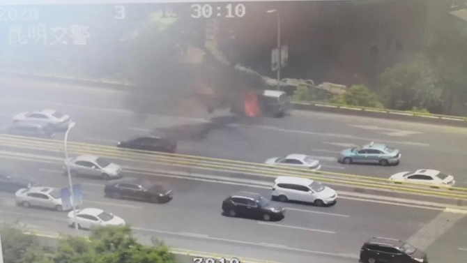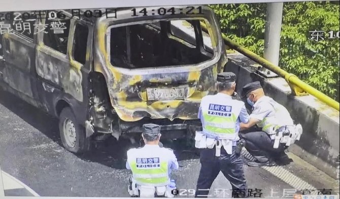 6月3日13时24分,昆明市公安局交警支队十一大队指挥室在视频巡查中发现,南二环A线官南立交有一辆云A号牌的灰色面包车停放在最右侧车道。民警正准备查询车牌联系车主时,该车驾驶人从车内下来,并且车头冒出阵阵浓烟。