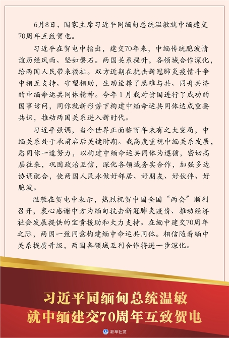 新华社北京6月8日电 6月8日,国家主席习近平同缅甸总统温敏就中缅建交70周年互致贺电。