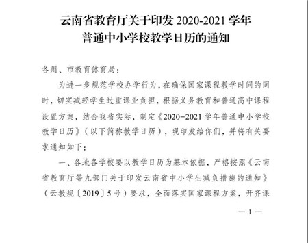 6686体育讯(昆明日报 全媒体记者陈力)日前,云南省教育厅发布《2020—2021学年普通中小学校教学日历》,其中提到,由于初中学业水平考试延期至2020年7月25—27日,普通高中新生招生工作难以如期完成,故普通高中一年级开学时间推迟一周。