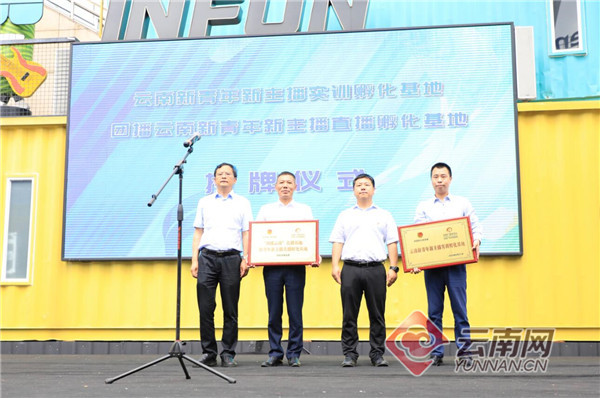 活动现场,共青团云南省委党组成员、副书记赵攀峰,云南广播电视台党委委员、纪委书记曹渭海为云南纺织(集团)股份有限公司、云南天度投资集团有限公司颁授了“团播云南”直播基地暨新青年新主播直播孵化基地牌匾。