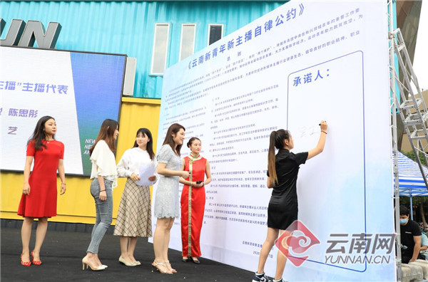 5名新青年新主播的主播代表共同宣读了《云南新青年新主播自律公约》,并在新青年新主播自律公约上签名,承诺自觉遵守新自律公约,共同构建互联网直播行业健康向上、文明清朗的生态圈,为推动我省高质量发展贡献青年力量。