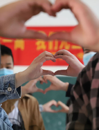 学生手比心形,感谢母亲 马玉/摄