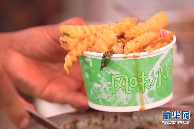 拌好佐料的炸洋芋(5月23日摄)。新华网 徐华陵/摄