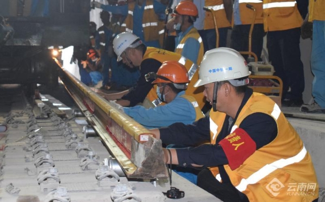 当天上午,在位于云南省大理市大理站西端,随着现场指挥人员一声号令,铺轨牵引车开始缓缓向前移动,施工人员迅速在铁轨两端进行测量、调整,确保轨道精准落下。20分钟后,两条长500米、重60吨的长钢轨平稳落在道床上,全线铺轨工作正式展开。