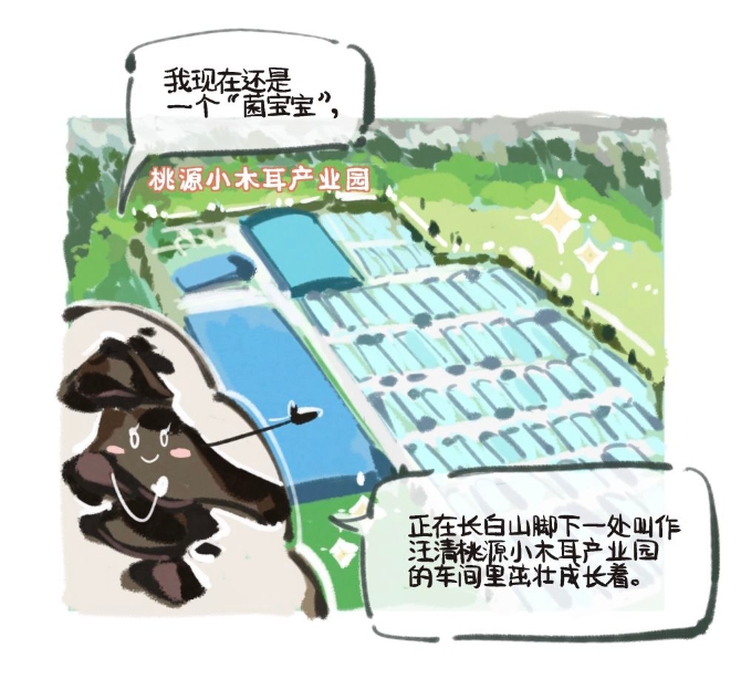 而我,现在还是个“菌宝宝”,正在长白山脚下一处叫作汪清桃源小木耳产业园的车间里成长着,你可以叫我的乳名“脆脆”。