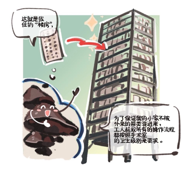 我现在住的是十几米高的钢架“楼房”。为了保证我的小家不混进外来菌类,工人叔叔所有的操作流程都按照手术室的卫生级别来进行规范。我们居住的车间里,由两位智能机器人负责日常的工作,杜绝了外来污染。“园长”孙永芳阿姨说,只有提高了标准,才能让“菌宝宝”都生长得健康,让来园里接我们的农民伯伯不用再为品质不一而发愁。