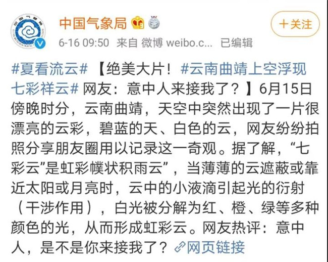 据中国气象局官方微博@中国气象局 发布的消息,据了解,这个“七彩云”是虹彩幞状积雨云” ,当薄薄的云遮蔽或靠近太阳或月亮时,云中的小液滴引起光的衍射(干涉作用),白光被分解为红、橙、绿等多种颜色的光,从而形成虹彩云。(6686体育综合)