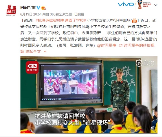近日,武警桂林支队的战士们应桂林市阳朔县凤鸣小学全校师生的邀请,在抗洪救灾之后,又一次回到了学校。戴红领巾、表演手势舞......学生们用自己的方式向英雄们表达谢意。同学们争先恐后请求武警叔叔给他们签名留念,这一幕“集体追星”的别样画风令人感动。(秦可、张宸硕、许东)