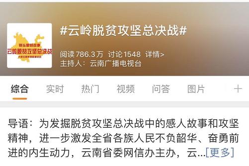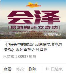 6月23日,《镜头里的故事·云岭脱贫攻坚总决战》大型主题系列直播之"会泽:易地扶贫立奇功"在曲靖市会泽县举行,会泽易地扶贫搬迁模式成功解决"一方水土养不了一方人"难题,直播全景展现搬迁点居住环境、生产条件、生活便利、休闲场景以及党委政府的服务模式,搬迁贫困户的幸福生活引发当地群众和全国网友的关注与热议,微博话题阅读接近800万。