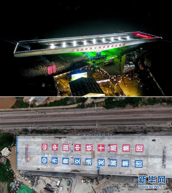 上图:新台高速公路山东平邑段跨兖石铁路转体桥进行转体作业中;下图为跨兖石铁路转体桥实施转体作业前画面(6月28日摄,拼版照片)。记者 郭绪雷 摄