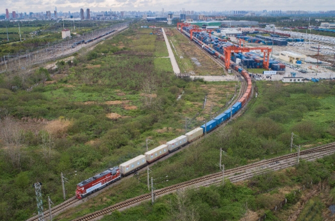 3月28日,开往德国杜伊斯堡的中欧(武汉)班列从中铁联集武汉中心站驶出。这是自疫情防控以来,从武汉开出的首趟中欧班列(无人机照片)。新华社记者 肖艺九 摄