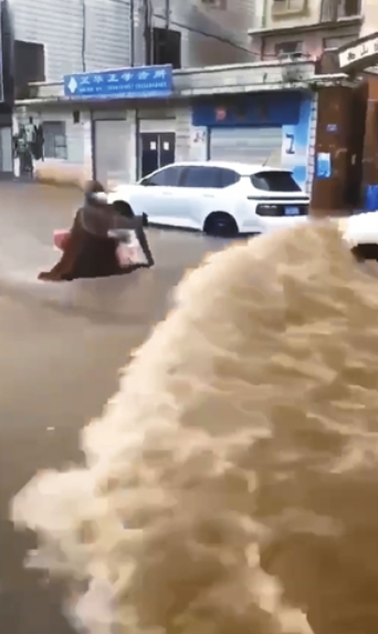 视频中,小哥骑行着电动车在雨中艰难行进,积水已经没过了车轮。突然,对面一辆白色越野车径直驶来,车辆行进时产生的水花一个浪头打在了电动车上,骑车小哥左摇右晃,他努力想控制平衡。可就在这时,一黑色越野车又驶过来,带起的“浪花”将小哥连人带车整个“掀翻”在了积水中。