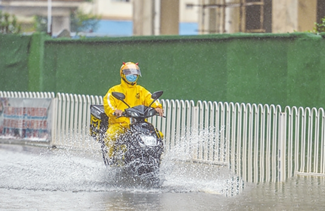 穿好站点配备的雨衣、雨靴,戴好安全帽,给手机套上防水套,饿了么骑手何贵强就出发了。雨天送外卖要千万分小心,这些都是他的必备防护装备。