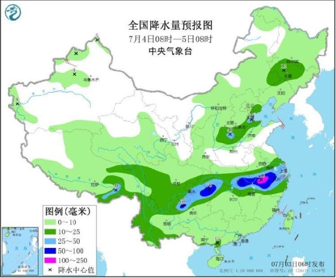 据中央气象台预计,7月4日至6日,西南地区至长江中下游等地大部地区有大到暴雨,局地伴有雷暴大风等强对流天气。其中重庆、贵州、云南、湖北、河南、安徽、江苏、上海等地部分地区有大暴雨,最强降雨时段为4日白天至5日白天。