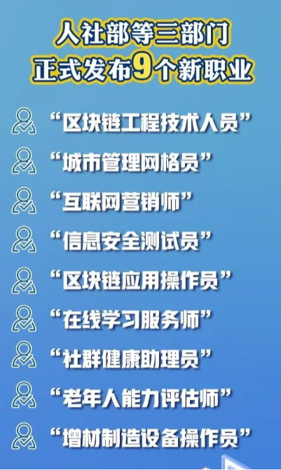 7月6日,人社部联合国家市场监管总局、国家统计局向社会发布了9个新职业,分别是“区块链工程技术人员”“城市管理网格员”“互联网营销师”“信息安全测试员”“区块链应用操作员”“在线学习服务师”“社群健康助理员”“老年人能力评估师”“增材制造设备操作员”。此次还发布了“直播销售员”“互联网信息审核员”等5个工种,同时将“公共卫生辅助服务员”职业下的“防疫员”“消毒员”和“公共场所卫生管理员”等3个工种上升为职业。