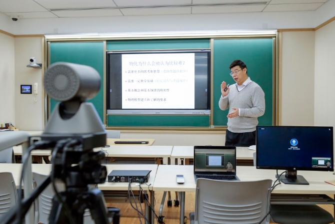 2月17日,北京大学教师黄建斌利用“北京大学在线课堂”系统为大二学生在线远程教授物理化学课程。(新华社记者沈伯韩摄)