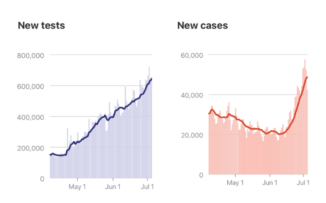 《大西洋月刊》发起的“新冠病毒追踪计划”统计了美国目前的检测规模,并与新增病例数进行了对比。图标数据显示,美国的每日新增确诊病例数量一度有所下降,在6月中旬又开始剧增,而检测规模则是持续扩大,两条曲线的变化并没有体现出明显的一致性。