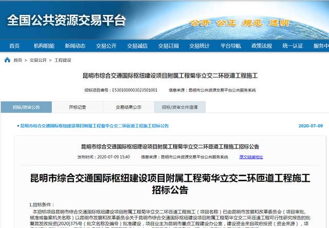 7月9日,全国公共资源交易平台发布昆明市重点工程建设办公室的一则招标公告——昆明市综合交通国际枢纽建设项目附属工程菊华立交二环匝道工程施工招标公告。公告显示:菊华立交将新增3条匝道通行。项目计划8月20日开工,计划竣工时间:2021年4月20日。