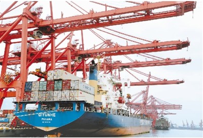 江苏连云港集装箱码头装卸货物呈现一派繁忙。王 春摄(人民视觉) |
