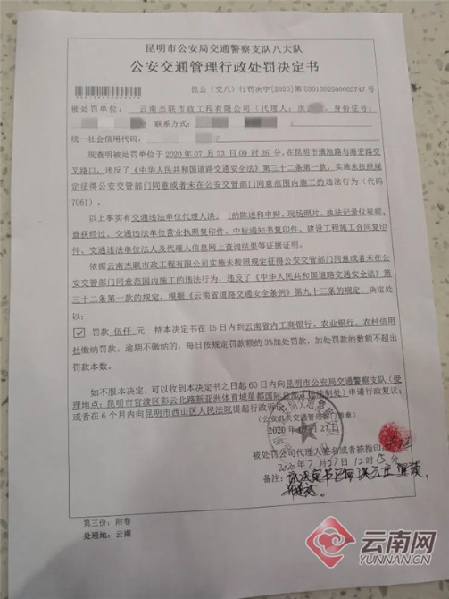 云南杰联市政工程有限公司未征得公安交通管理部门同意、围挡占用道路施工影响交通通行的违法行为违反了《中华人民共和国道路交通安全法》第三十二条第一款的规定,根据《云南省道路交通安全条例》第九十三条之规定,对施工方作出了罚款5000元的处罚;同时责令施工单位停止违法行为,迅速恢复交通。