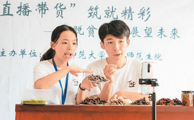 7月24日,在江西省吉安市新干县潭丘乡产业就业扶贫服务中心,江西师范大学暑期社会实践大学生正在直播推销当地农家小吃酱饼,助力乡村振兴。 李福孙摄(人民视觉) |