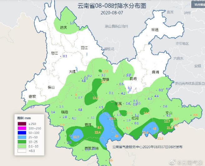 据云南气象的消息,8月7日08时--8月8日08时:普洱、西双版纳阴有中到大雨局部暴雨,怒江南部、大理、楚雄西部、保山、德宏、临沧、红河南部、文山西南部多云间阴有小到中雨局部大雨,其它地区多云有阵雨。