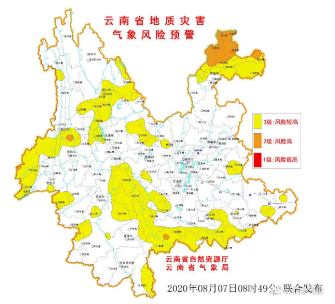 8月7日8时49分,云南省自然资源厅和云南省气象局联合发布地质灾害气象风险橙色预警,预计8月7日8时—8月8日8时,昭通,怒江,德宏及红河部分地区发生滑坡泥石流等地质灾害的风险高(橙色预警);昭通、曲靖,怒江、丽江、大理,德宏、保山,临沧、普洱、西双版纳,红河,文山,楚雄及玉溪部分地区发生滑坡泥石流等地质灾害的风险较高。
