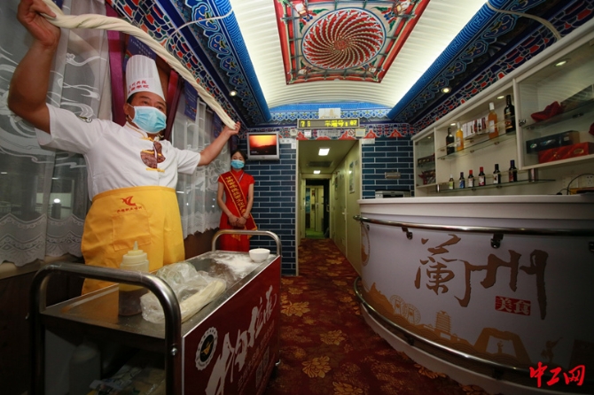环西部火车游专列是上的“火车老街”兰州美食拉面展示。曹文福摄