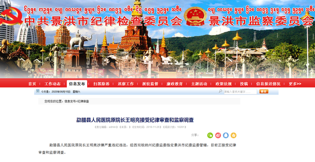 2018年11月,景洪市纪委监委网站发布消息:勐腊县人民医院原院长王明亮涉嫌严重违纪违法,经西双版纳州纪委监委指定景洪市纪委监委管辖,目前正接受纪律审查和监察调查。
