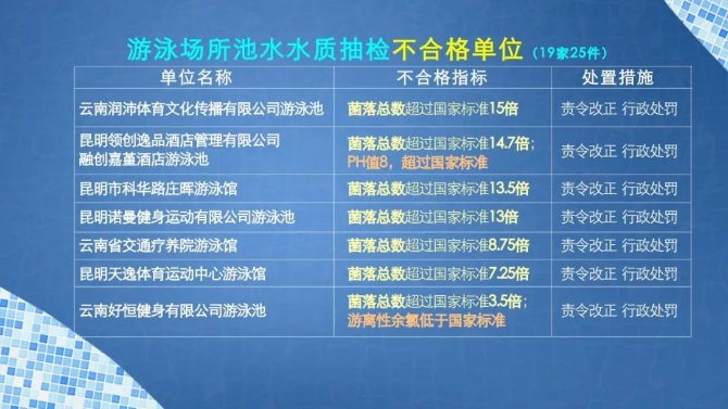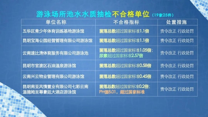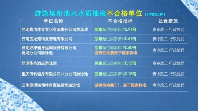 据了解,根据《公共场所卫生管理规范》和《公共场所卫生指标及限值要求》的要求,游泳池水水质检测项目为细菌总数、大肠菌群、尿素、游离性余氯、浑浊度、PH值6项指标。昆明市卫生健康委员会综合监督执法局将按照《游泳场所卫生规范》要求,依据《公共场所卫生管理条例实施细则》规定,依法责令19家游泳场所立即改正并将行政处罚。