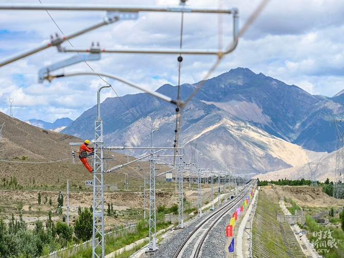 △施工人员对拉林铁路(川藏铁路拉萨至林芝段)沿线上空架设的供电线路进行复检。拉林铁路是西藏首条电气化铁路,正线全长435.48公里。