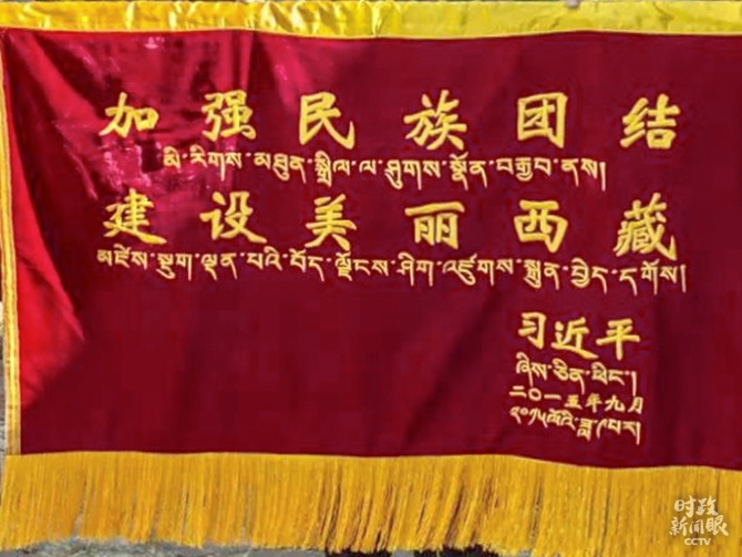 △2015年,在西藏自治区成立50周年庆祝大会上,西藏300多万各族儿女收到习近平题词的“加强民族团结 建设美丽西藏”贺匾。
