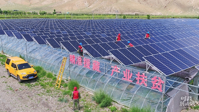 △湖北襄阳某供电公司援藏帮扶工作人员检修光伏发电设备,解决当地养殖户和种植户用电需求。
