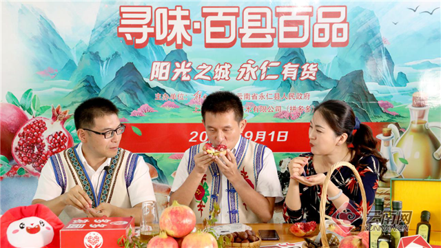 永仁县副县长张剑(左)和刘小青(中)一起走进直播间,为永仁特色农产品直播带货。上官瑜/摄