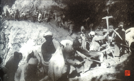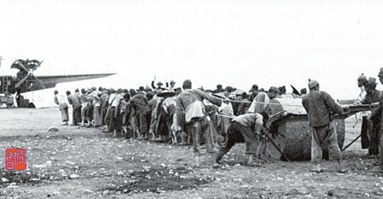 修建机场跑道的多道工序,都需要召集50-150民工拉动石碾子来回碾压