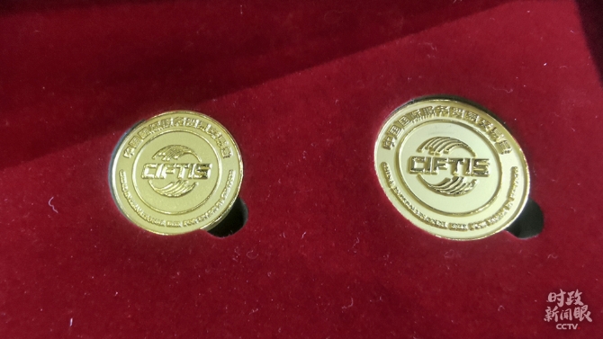 △每位代表座位上都摆有服贸会纪念章(总台央视记者韩锐拍摄)