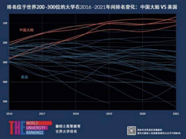 2016年至2021年间世界排名200-300位中国大陆和美国高校的排名变化 图片来源:THE