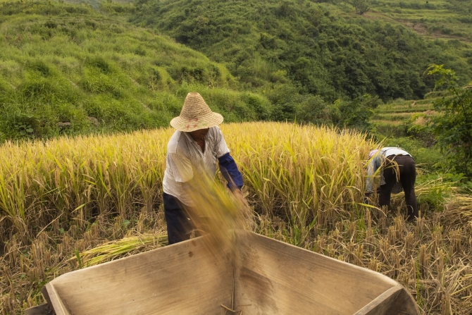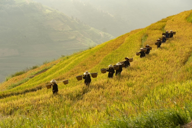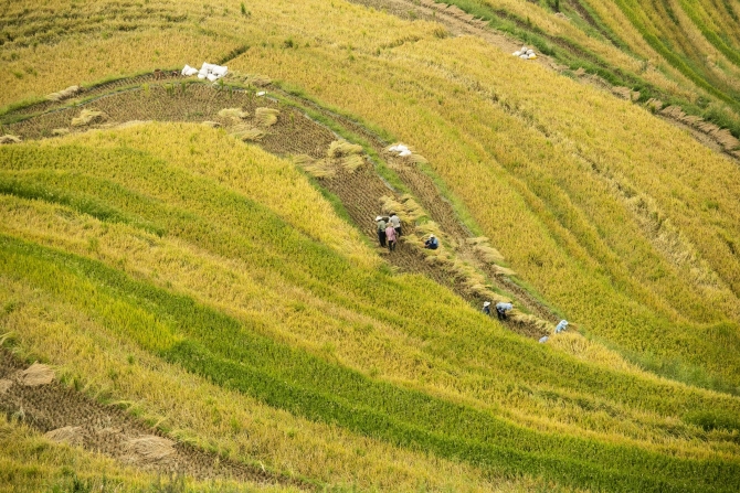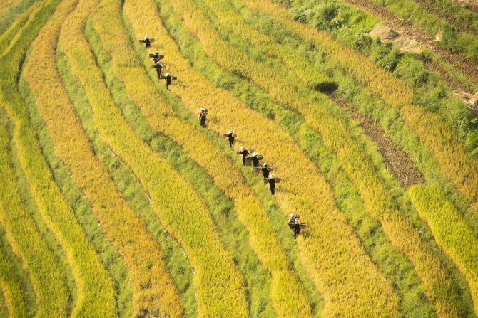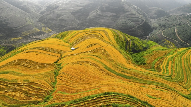 秋天的梯田最为美丽:稻谷成熟之际,金黄的稻田,沉甸甸的稻穗在风中摇曳。