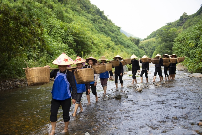 秋天是收获的季节:村民割稻子、挑竹箩、打谷子,一派喜气洋洋的丰收景象。