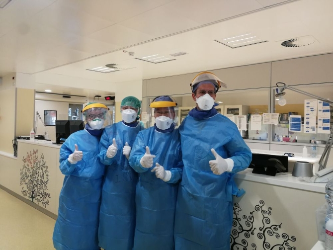 3月18日,中国抗疫医疗专家组在意大利帕多瓦帮助当地医院医生应对新冠疫情。(新华社发)