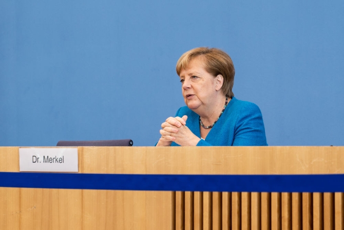 8月28日,在德国首都柏林,德国总理默克尔出席记者会。她在回答新华社记者提问时表示,德国在担任欧盟轮值主席国期间,将推动欧中进一步加强合作。(新华社记者 任珂摄)